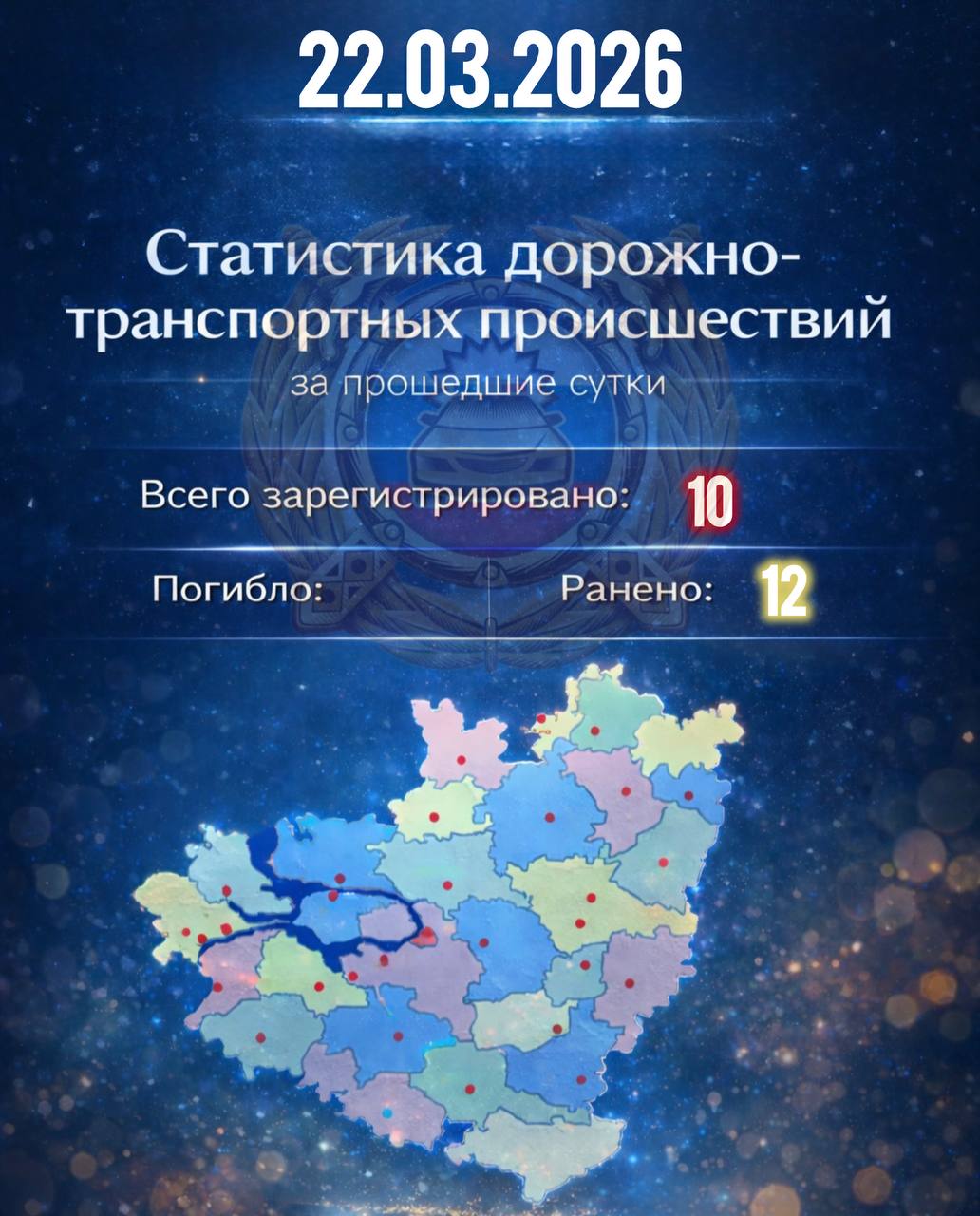 За 22 марта на дорогах региона зарегистрировано 10 дорожно-транспортных происшествий, в которых пострадали 12 человек.