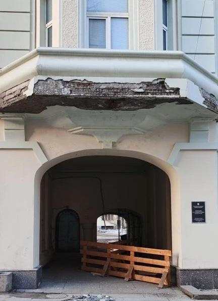 Облицовка продолжает осыпаться с балкона дома Жуковых на улице Ленинградской, 46. Судя по фотографиям в сервисе «Яндекс.Карты», это начало происходить как минимум в прошлом году, однако, на свежих снимках, присланных в редакцию, видно, что сейчас ситуация ухудшилась.