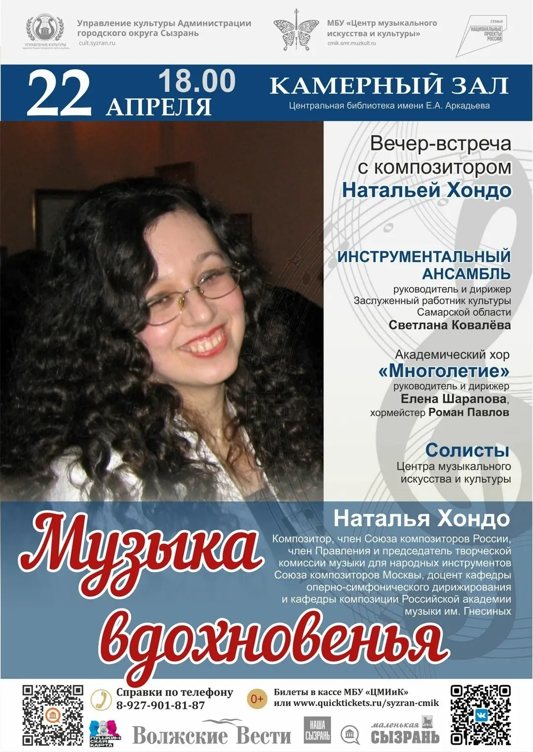 22 апреля, 18:00 – вечер-встреча с композитором Натальей Хондо «Музыка вдохновенья», Камерный зал Центральной библиотеки им. Е. И. Аркадьева