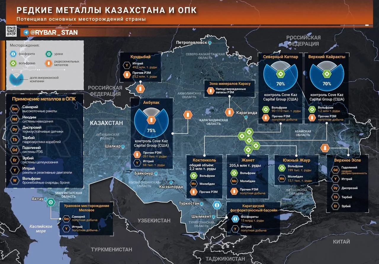 Также эта компания на 75% контролирует добычу на месторождении Акбулак, богатом иттрием и другими РЗМ. В общем, освоение казахских недр идёт полным ходом.