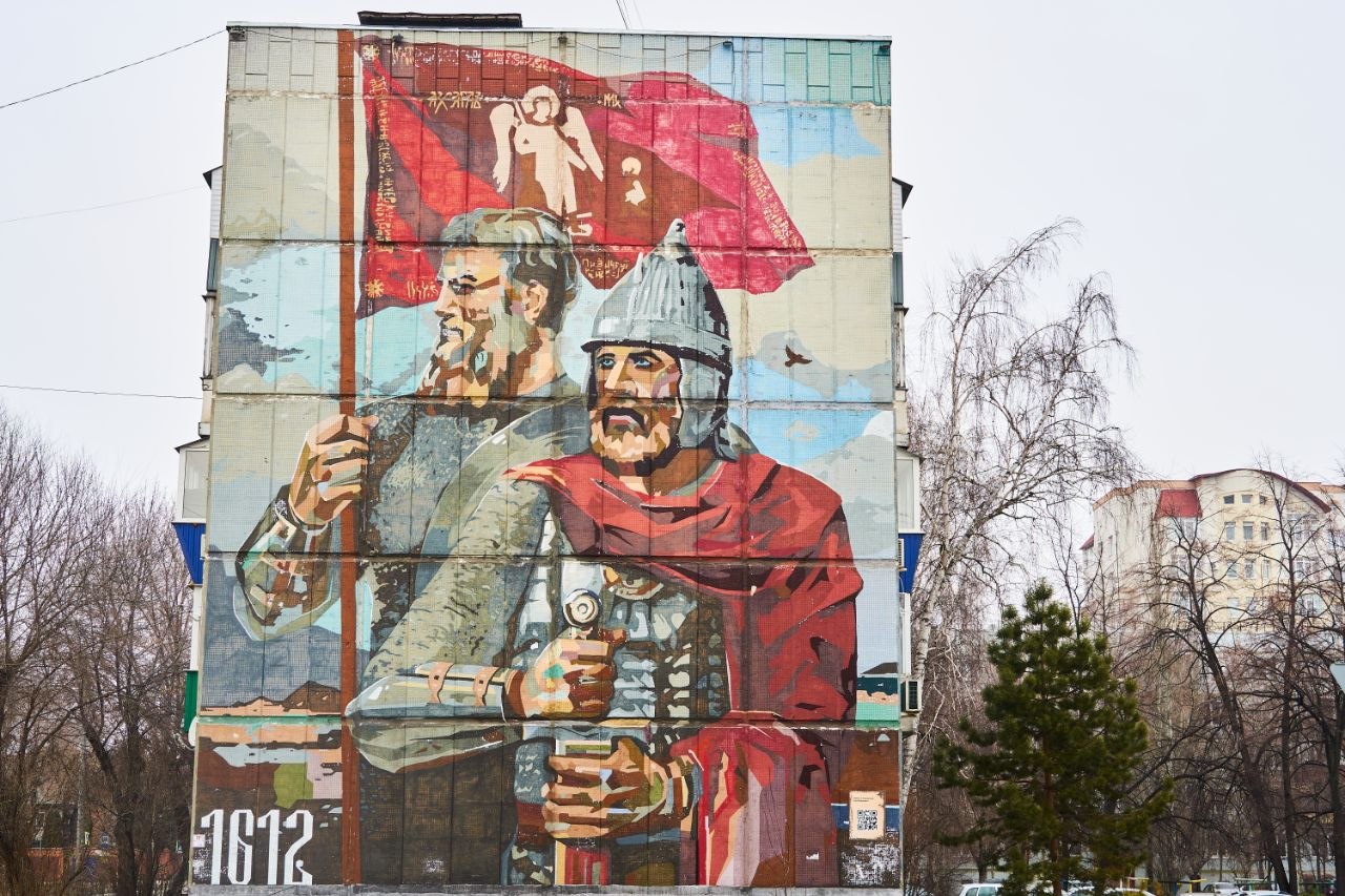 На углу улиц Володарского и Ульяновской фасад дома украсил мурал, посвященный Дню народного единства. В центре сюжета исторические личности — Минин и Пожарский