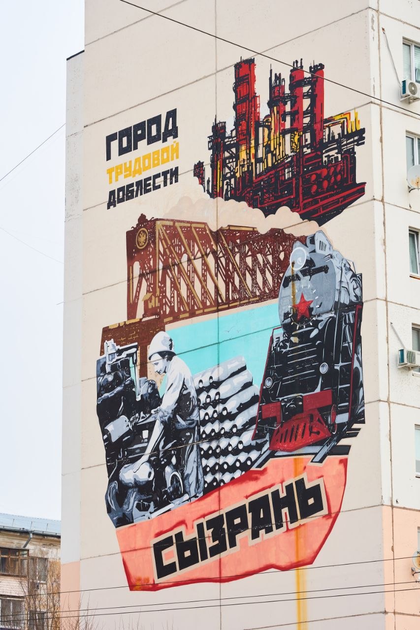Немного позднее на фасаде дома по проспекту 50 лет Октября, № 12А появился мурал в жанре советского плаката, отражающий значимые моменты военной истории Сызрани — города трудовой доблести.