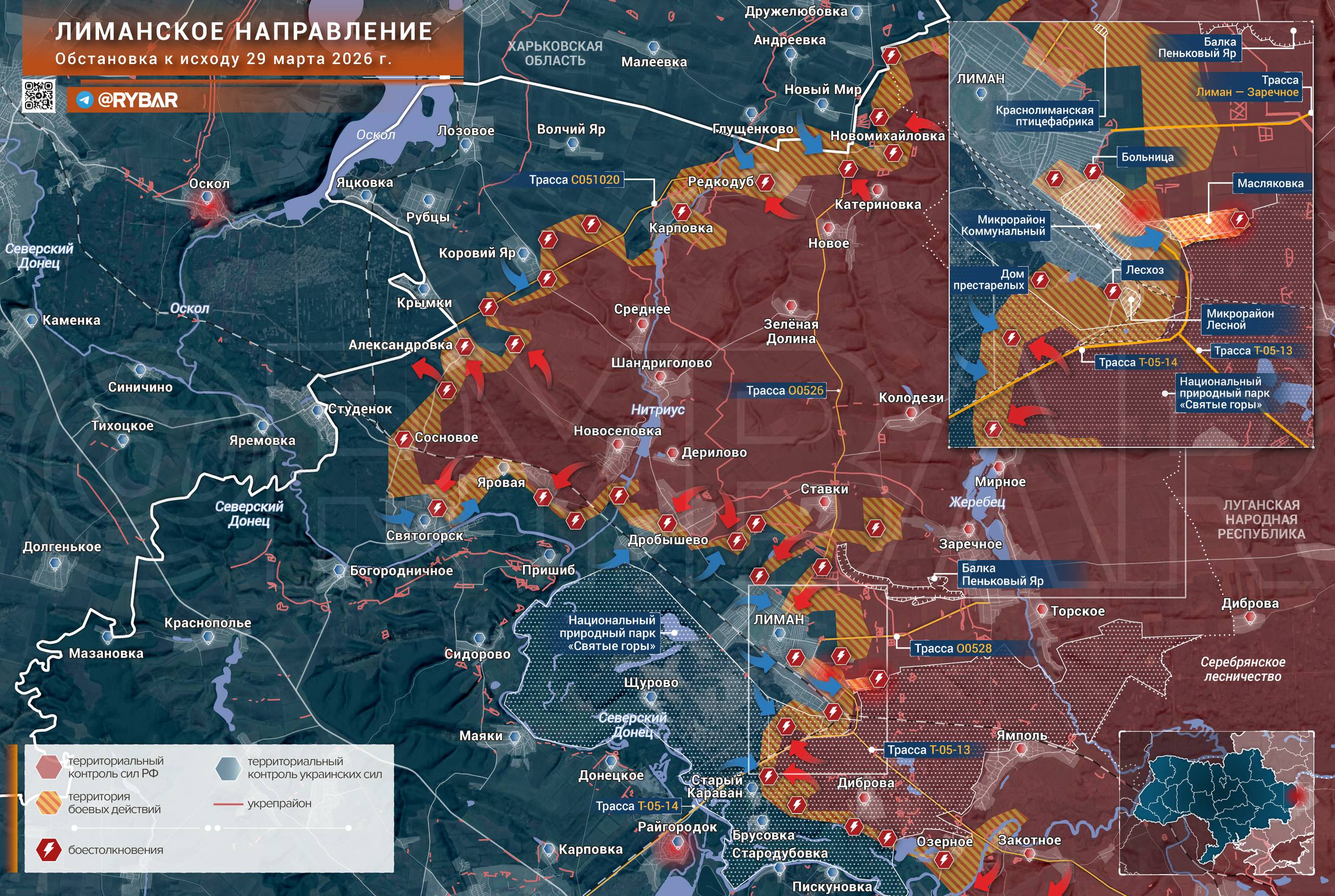 На Лиманском направлении противник в ходе контратаки пробился на территорию района Масляковка, однако закрепиться на занятых позициях ему не удалось. В то же время части ГВ «Запад» продолжают атаки в сторону Северского Донца.