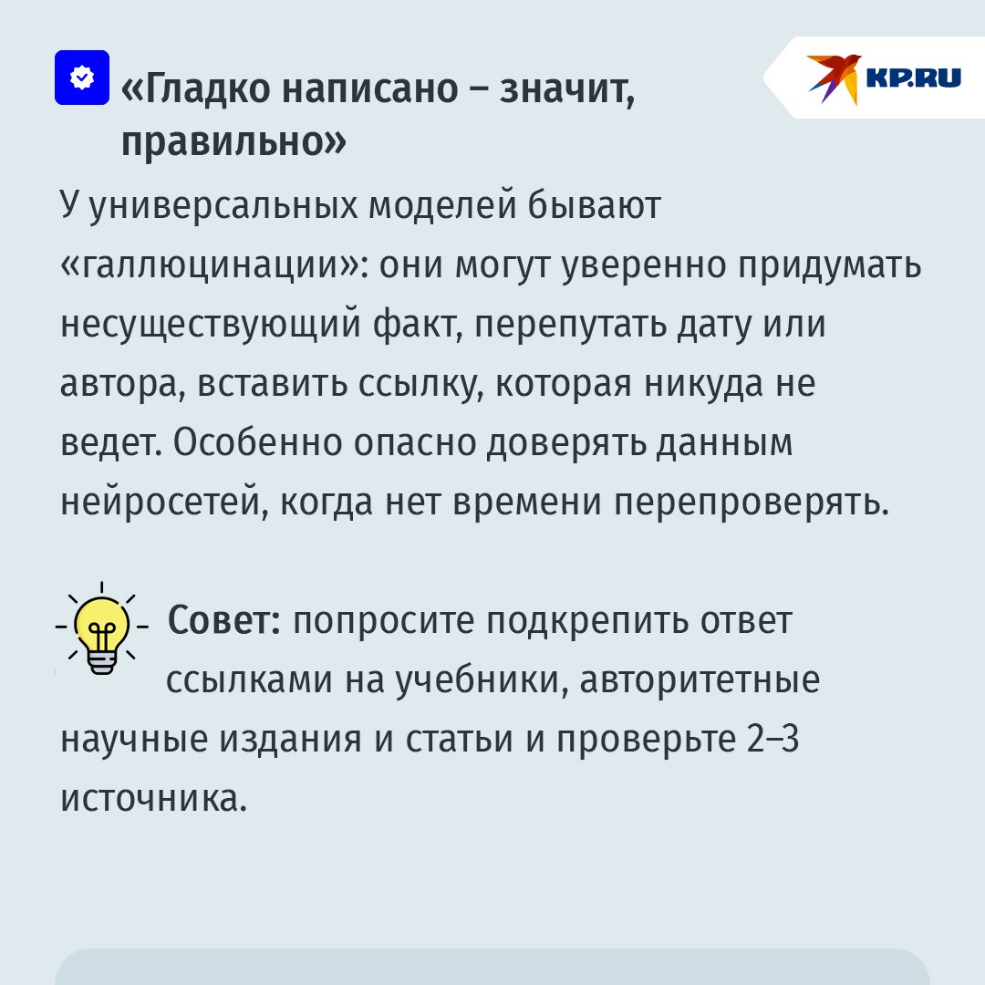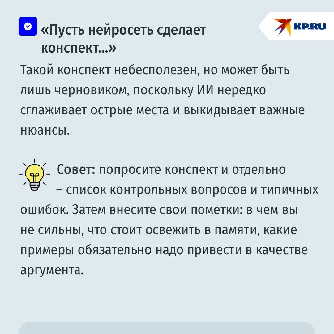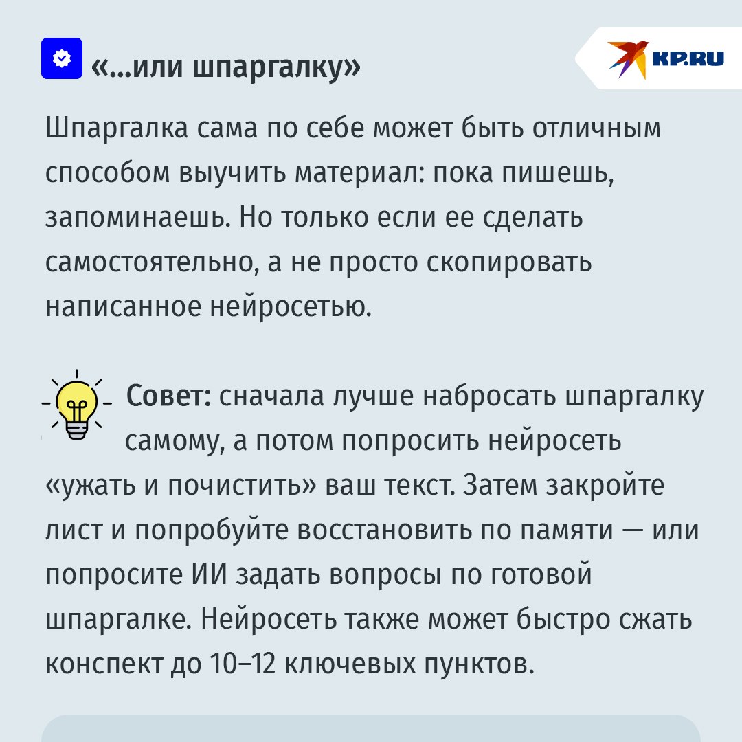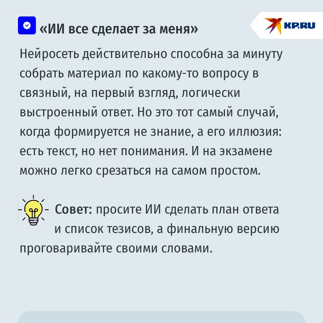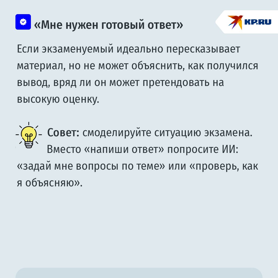 Напоминание родителям! Сам факт использования ИИ не синоним списывания. Важнее, какую роль в процессе подготовки к экзамену играет учащийся, а какую – нейросеть. ИИ может объяснять и тренировать, но он не должен подменять самостоятельную работу вашего чада, формулирование выводов и проверку фактов. Поэтому нормально использовать ИИ для подготовки структуры, объяснений и материалов для самопроверки.