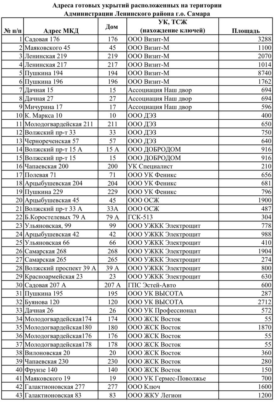 Адреса укрытий вы можете найти здесь. Ранее был опубликован список укрытий в Ленинском районе (смотрите фото). Скоро будут так же известны списки в других районах Самары.
