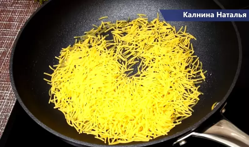 - При обжаривании на сковороде вермишель приобретает ослепительный золотистый цвет и оригинальный аромат, добавляя вкусовые нюансы благодаря воздействию высоких температур.