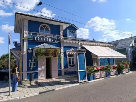 Трактир расположен в уютном синем домике с резьбой по дереву, что создает атмосферу старины с первых шагов. Небольшая летняя площадка на три столика добавляет нотку очарования, и, несмотря на яркое солнце, многие решают посидеть внутри, где царит настоящая «купеческая» атмосфера.
