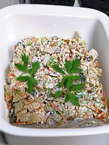 Готовый салат прекрасно подходит как самостоятельное угощение. Кроме того, он станет великолепной начинкой для лаваша. Завернув порцию в тонкий армянский хлеб и добавив немного лимонного сока, получится легкий и яркий аналог любимой шаурмы.