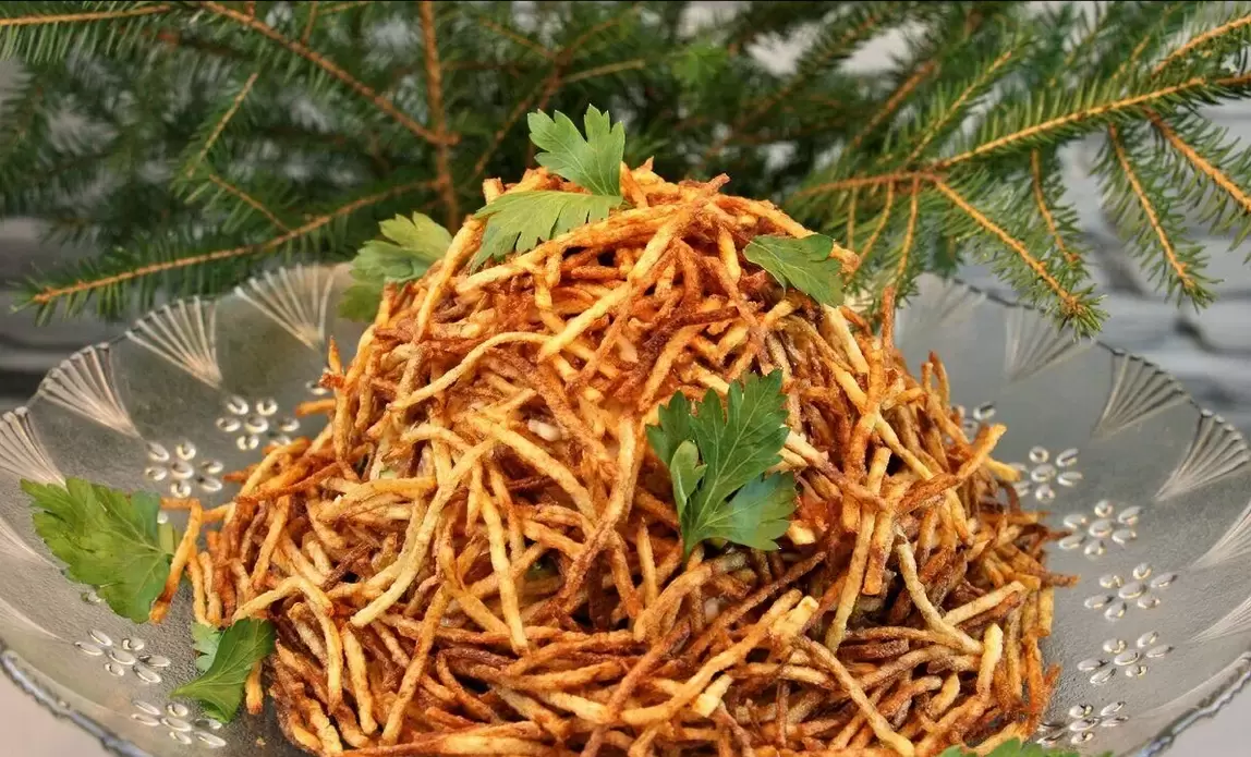 Стог сена собирают из тёплой картошки, тонкой свиной соломки и свежих овощей, заправляя всё майонезом. Важна не скорость, а равномерность обжарки и аккуратность нарезки: каждый слой сохраняет свой характер и цвет.