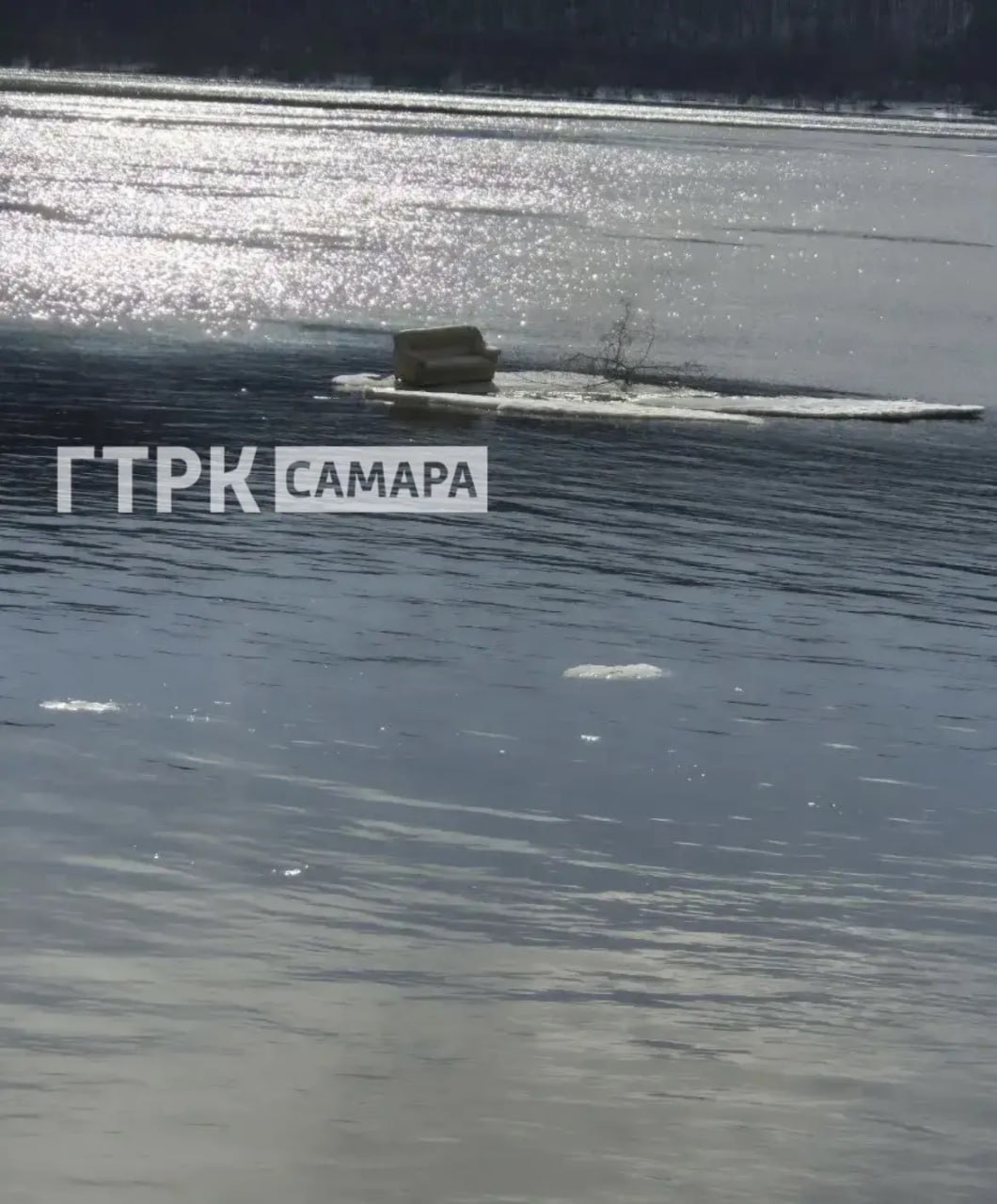 Рядом можно заметить плывущий на льдине диван.