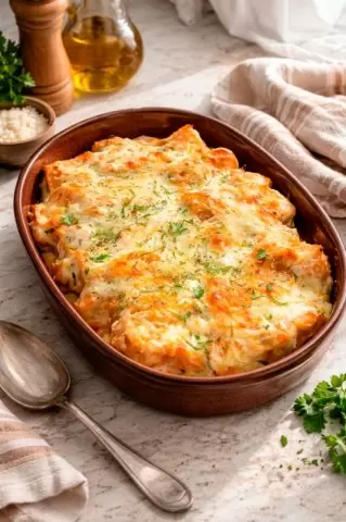 5. Поместить форму в разогретую духовку. Запекать в течение 25-30 минут. После приготовления дать настояться 10 минут, затем посыпать измельченной зеленью.