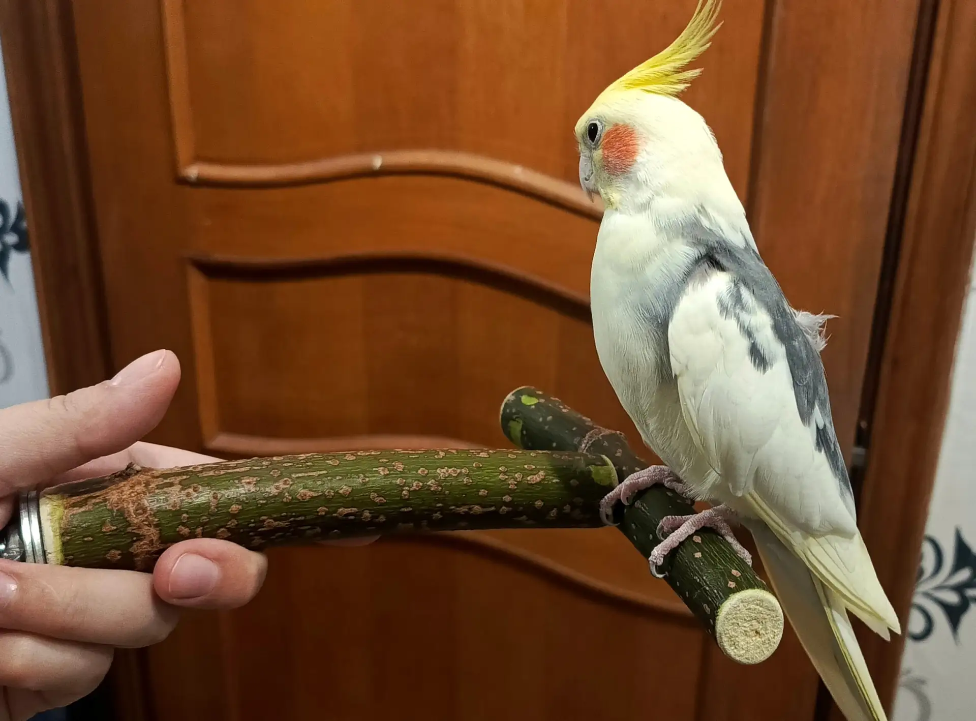 - В руки не дается, но на контакт с человеком идет. Реагирует, если ласково произнести «Кирюша» или «птичка». Садится на предложенную жердочку или палочку, может наклонять голову, чтобы его поцеловали. Так он успокаивается,