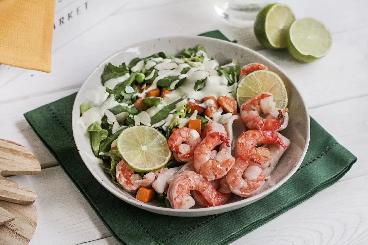 Теперь можно перейти к финальной части. На сервировочную тарелку выложите микс салата, запеченный батат, морепродукты и стручковый горошек. Заправьте соусом и аккуратно перемешайте. Для завершения блюда посыпьте его миндальными лепестками.