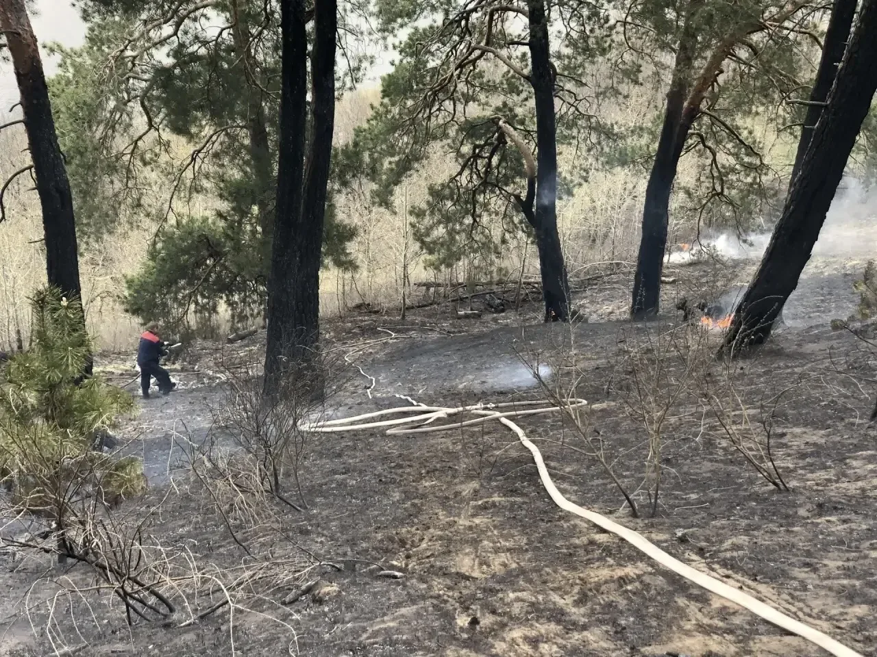 18 апреля возгорание обнаружили камеры видеонаблюдения. На место выдвинулись бригады и техника с 5 ближайших лесопожарных станций.