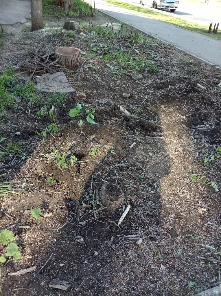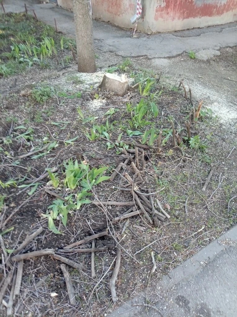 «Несколько деревьев спилены под корень, ветки отпилены так, что от деревьев остались одни обрубки. Ограда со столбиками выкинута из хорошего бруса. Цветы сломаны, часть клумб просто срыта вместе с землей и всеми цветами под корень. Их просто нет. Сортовые ирисы, анемоны, тюльпаны, пионы, хризантемы, наперстянка — всё в хлам», — пишет очевидица.