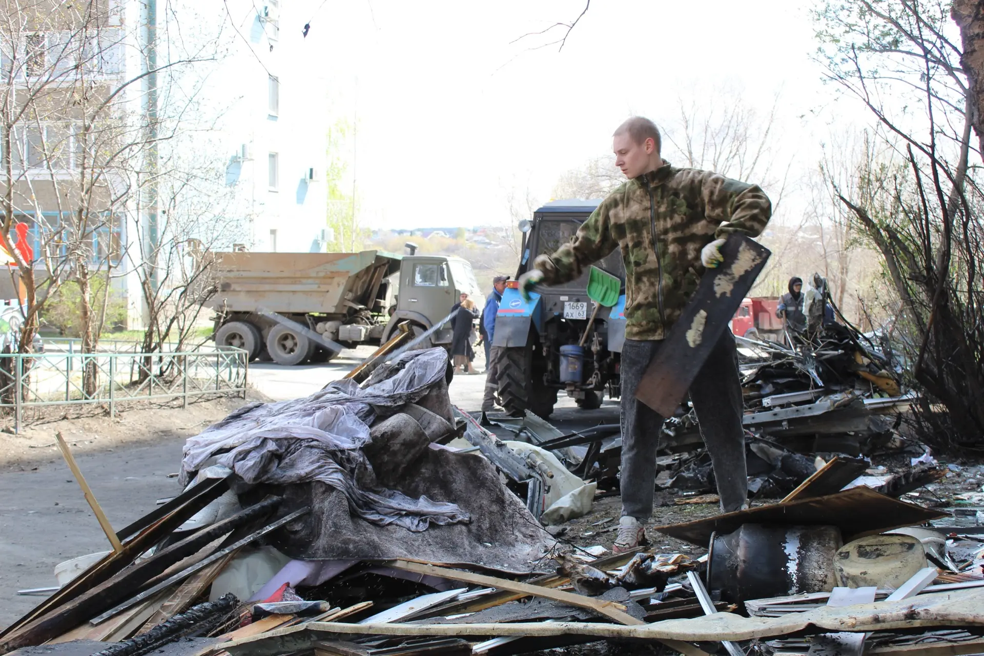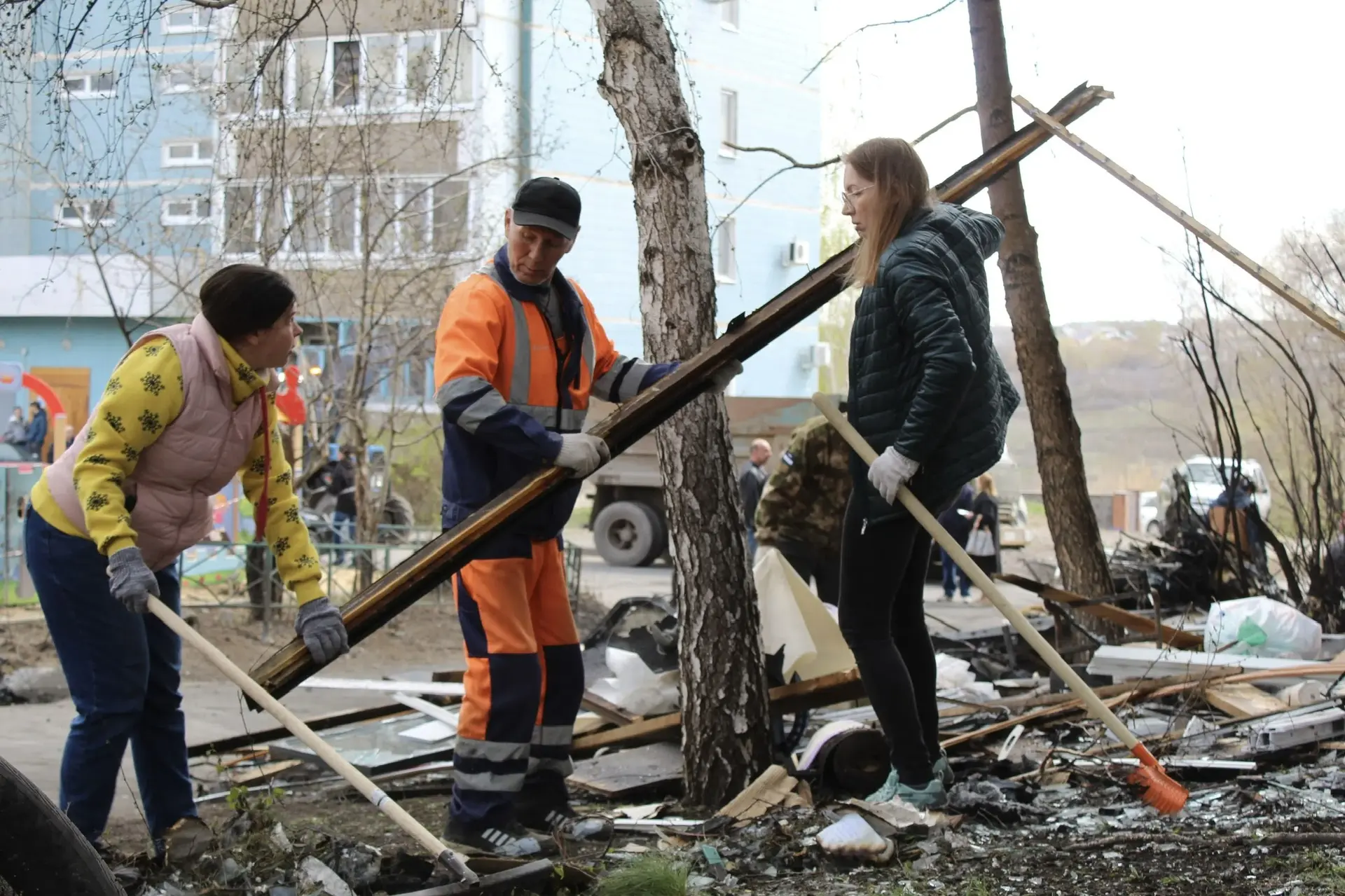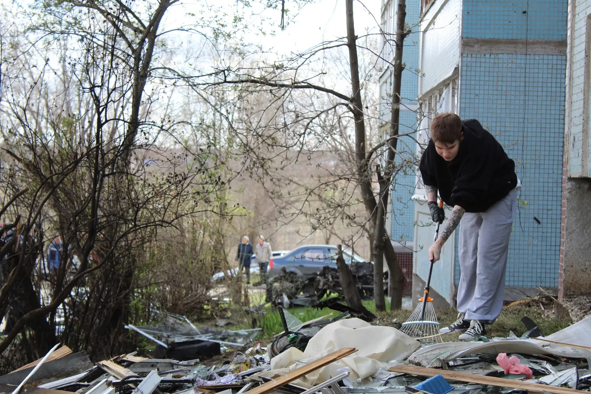 Жители дома № 44 по ул. Звездной и соседних домов поддержали идею провести уборку на придомовой территории. После атаки БПЛА здесь осталось много мусора.
