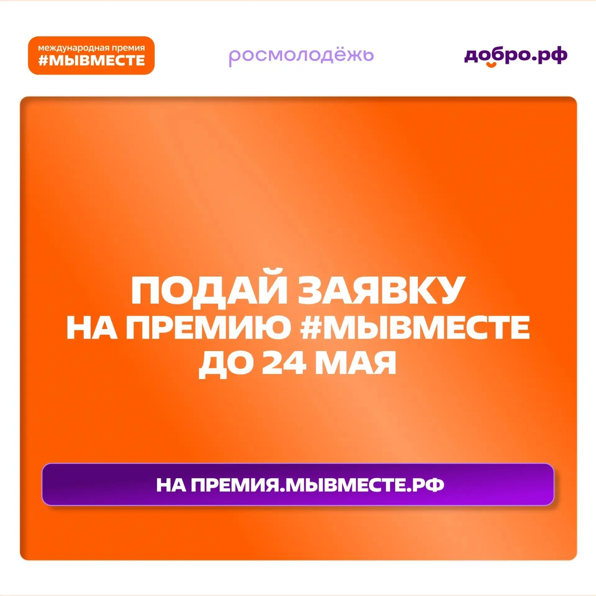 Приём заявок продлится до 24 мая на премия.мывместе.рф