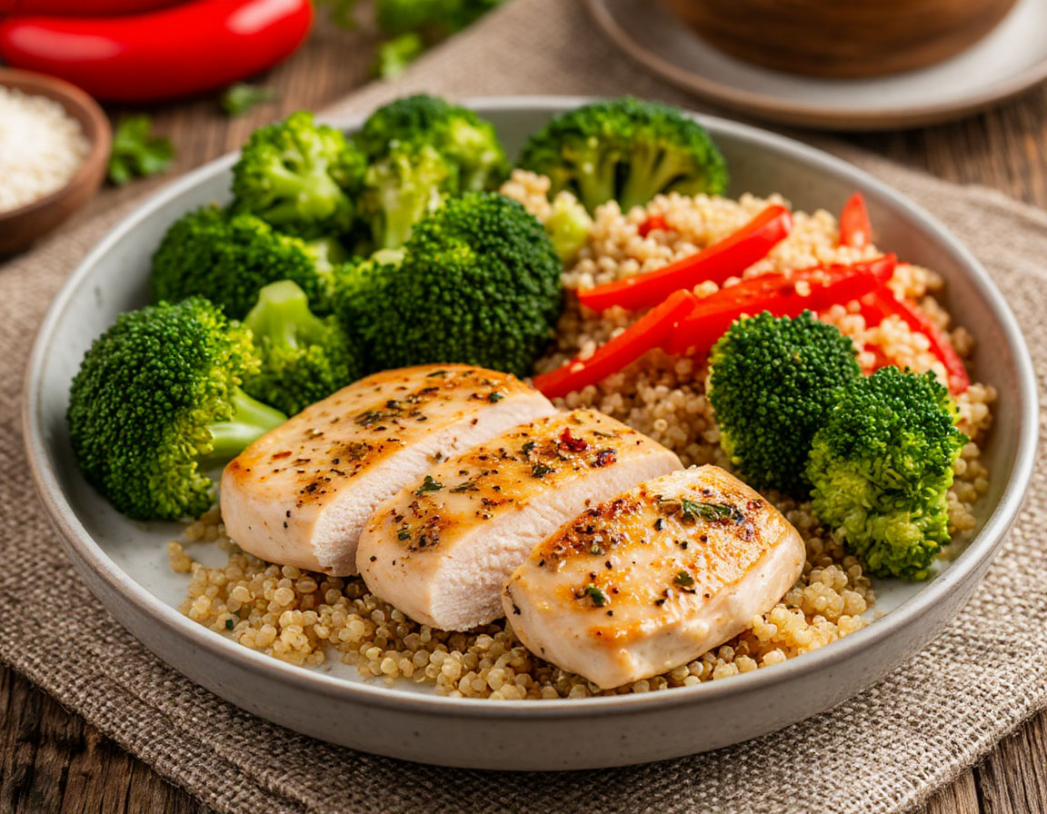 Сытный обед №1: Куриное филе в йогуртовом маринаде с киноа и овощами